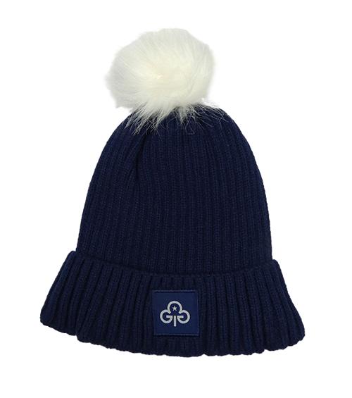 Tmavomodrá pletená čapica s nášivkou a brmbolcom