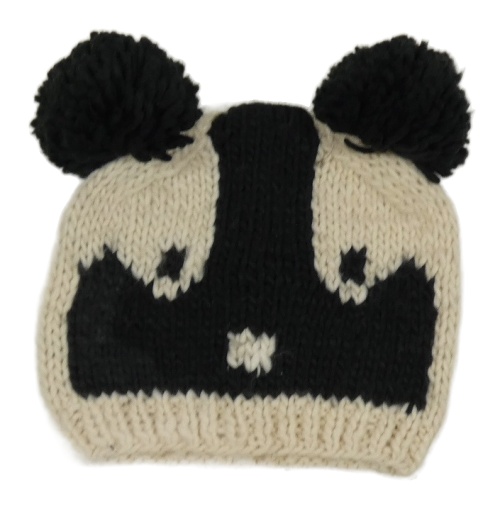Smetanovo-čierna pletená čapica s ňufáčikom a bambulemi