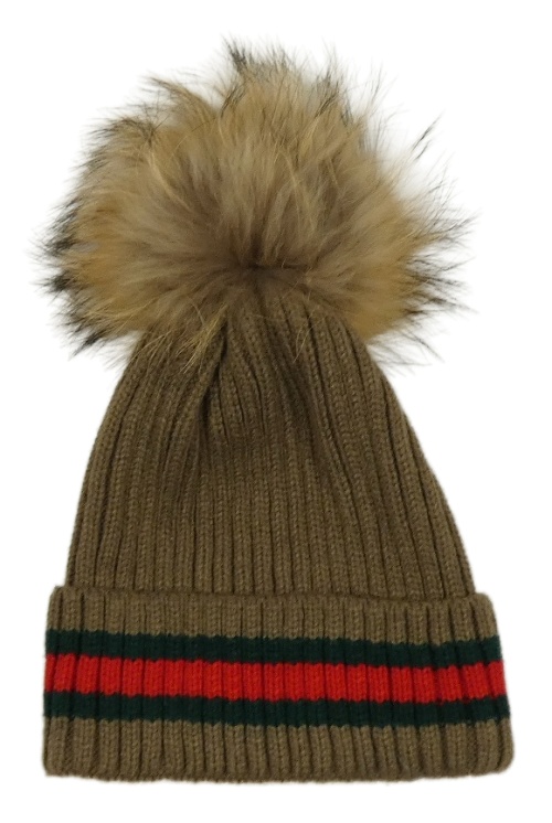 Hnedá rebrovaná pletená čapica s pruhmi a brmbolcom