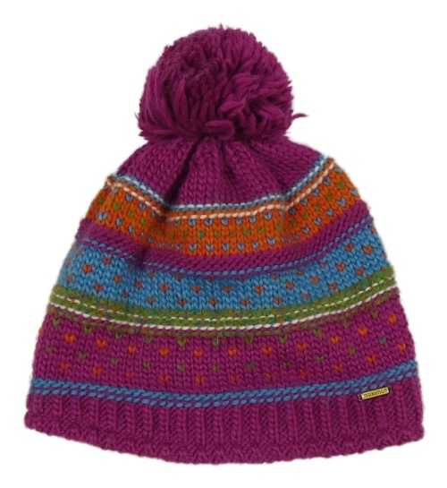 Fuchsiovo-modro-zelená pruhovaná pletená čapica s brmbolcom