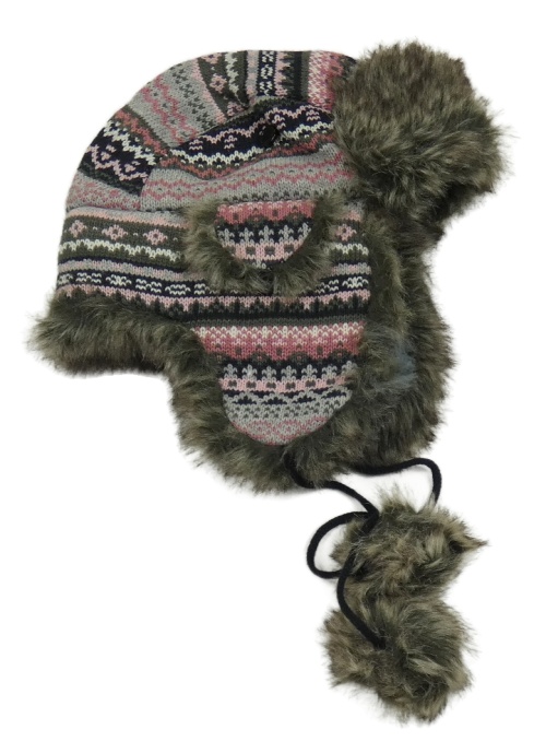 Šedo-růžová vzorovaná pletená zateplená beranice s kožešinou