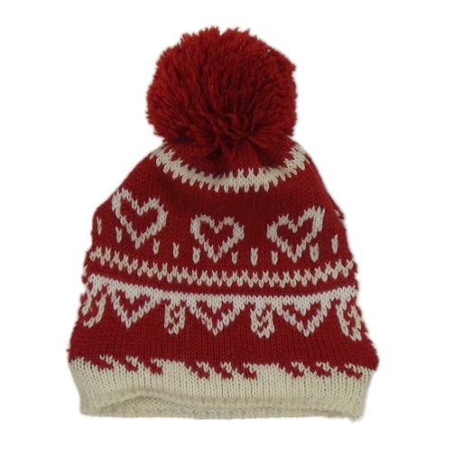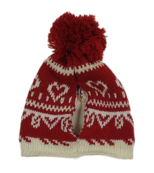 Červeno-smotanová vzorovaná pletená čapica s bambulí pro psa