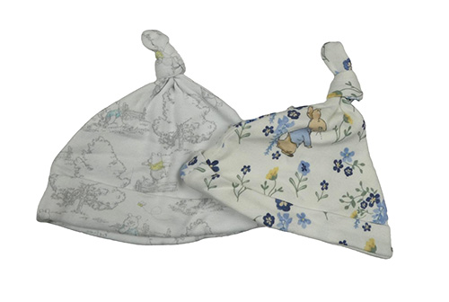 2x bavlněná čepice - smetanová kvetovaná s Peter Rabbit + biela s Púem a přáteli