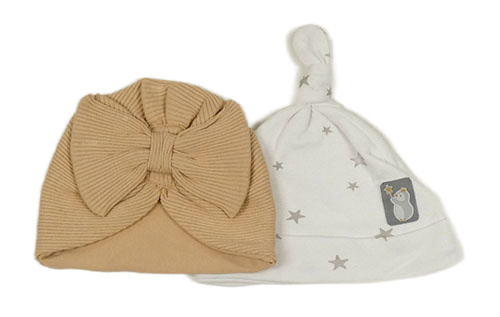 • 2x - Čepice - Béžová žebrovaná turbanová s mašlou RIVER ISLAND, bílá s hvězdičkami a tučňáčkem St. Bernard