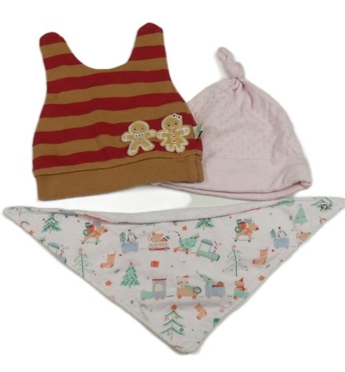 3set- 2x čepice pruhovaná s perníčky+ světlerůžová+ růžový slinták s obrázkami