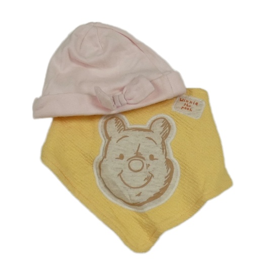 2set- svetloružová čapica s mašlí+ žlutý slintáček s medvídkem Pú