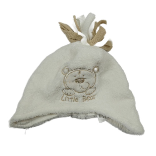 Biela plyšová podšitá čapica s medvěďom a strapcemi