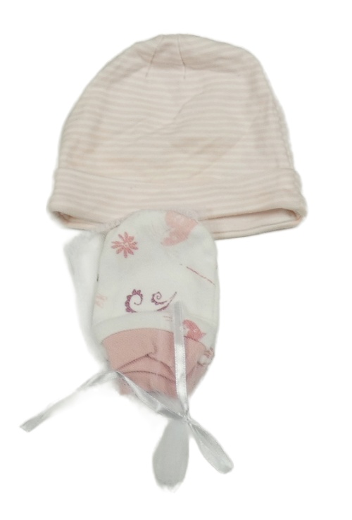 2set - Světlerůžovo-bílá pruhovaná čepice + květované rukavice