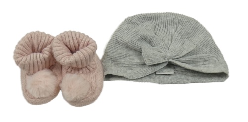 2set - Sivá melírovaná rebrovaná pletená turbanová čapica s mašlí + ružové pletené cápačky s bambulí vel. 16