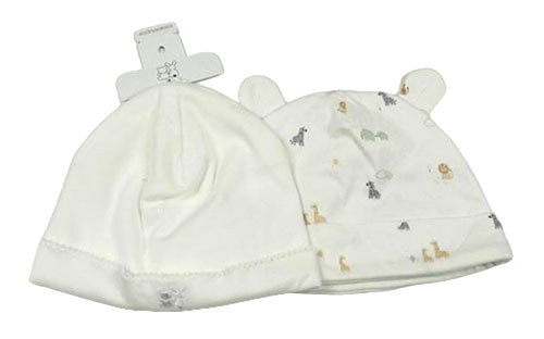 2x bavlněná čepice - biela so zvířaty + biela s výšivkou