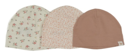 3x čepice - starorůžová + bílo-růžová + biela s kvítky