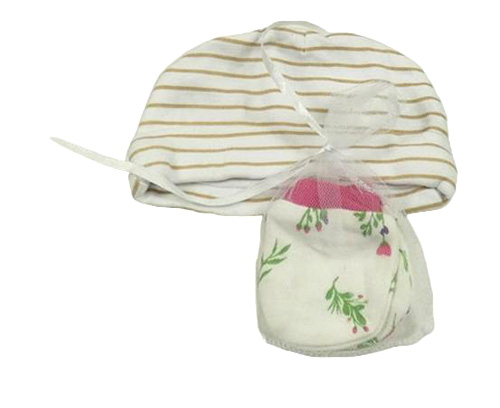 2set - Bílo-béžová pruhovaná bavlněná čepice + smetanové květované rukavičky