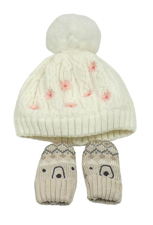2set - Smetanová pletená čepcie s kvety a bambulí + béžové rukavice so vzorom