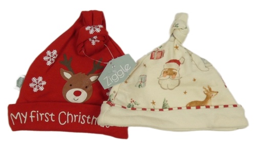 • Nová - 2x - Vánoční čepice - Červená s vločkami, smotanová s obrázkami Tu