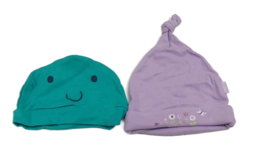 2x bavlněná čepice - tyrkysová s očima + lila s kvietkami