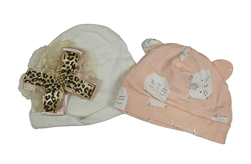 2x bavlněná čepice - ružová s kočkami + biela s mašlou s čipkou