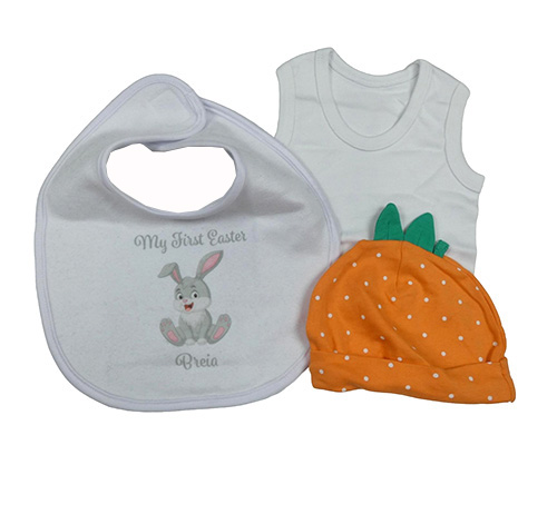 3set - Oranžová puntíkatá bavlněná čepice - dýně + bílý slinták s králíkem + biela košieľka