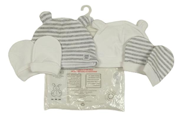 Nové - 4set - Biela bavlnená čapica s oušky + šedo-bílá pruhovaná + 2x rukavičky Dunnes