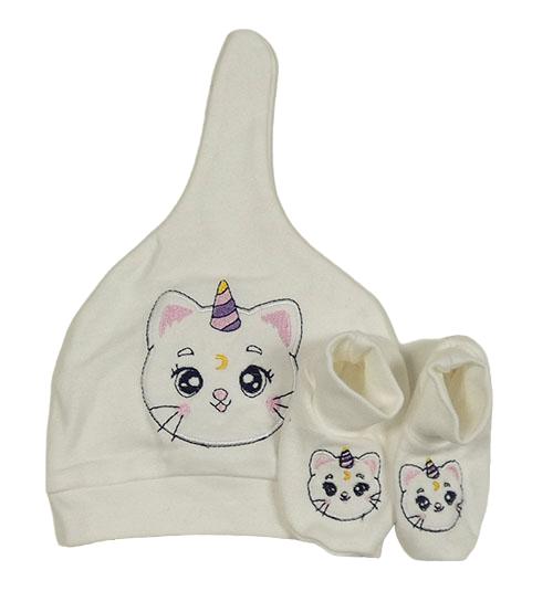 2set - Biela bavlnená čapica s kočkou + cápačky