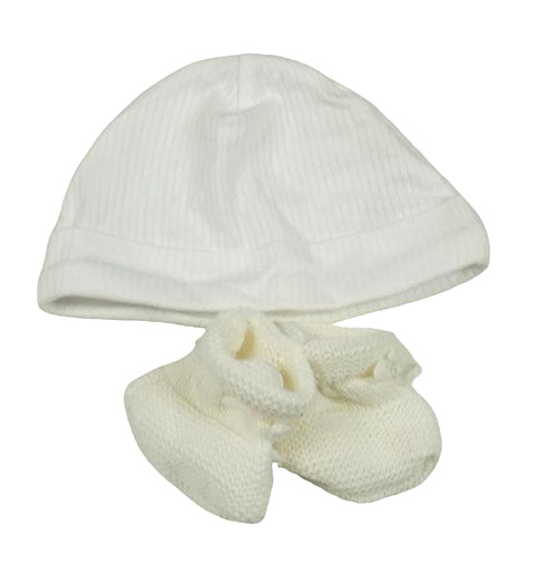 2set - Biela pruhovaná bavlnená čepice + smotanové pletené cápačky