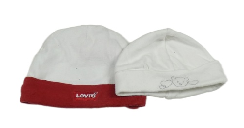 2set - Bielo-červená bavlnená čapica s nápisem + biela s medvedíkom