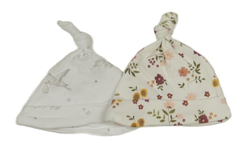 2x čepice - biela s ptáčky + smetanovo-barevná kvetovaná