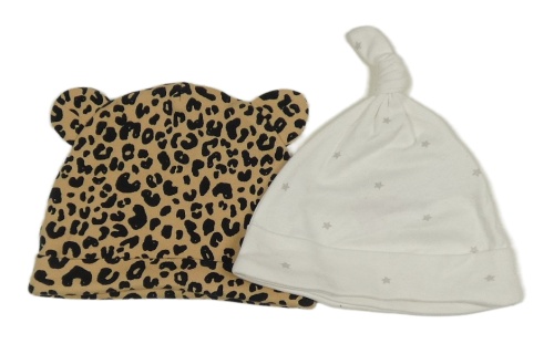 2x čepice - béžovo-černá leopardí + biela s hviezdičkami