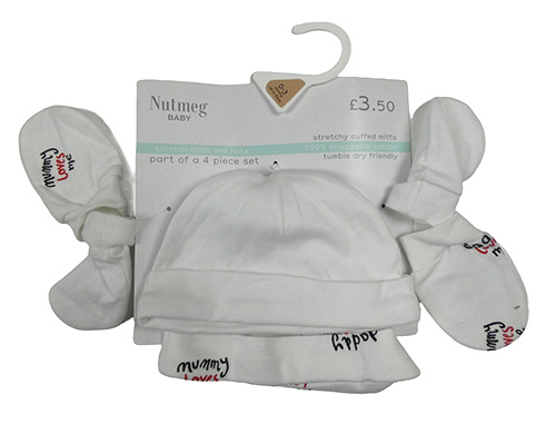 Nové - 4set - Bílá bavlněná čepice + s nápisem + 2x rukavičky Nutmeg