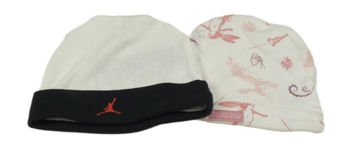 2x čepice - bílo-černá + biela s ružovymi obrázky