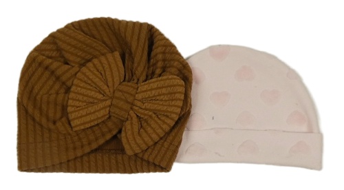 2x čepice - hnědá turbanová + svetloružová so srdiečkami