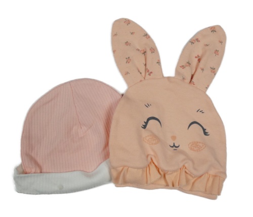 2x bavlněná čepice - růžovo-bílá žebrovaná s žirafou + s králikom