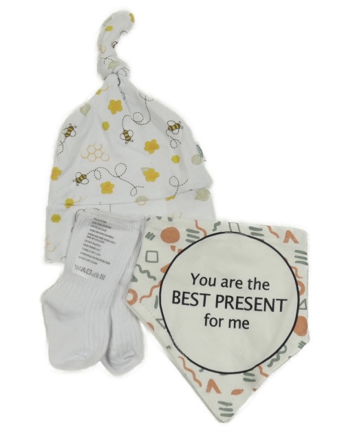 3set - Biela bavlnená čapica s včelami + smetanový vzorovaný slinták s nápisem + biele ponožky