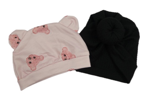 2x čepice - černá žebrovaná s uzlem + ružová s medveďmi