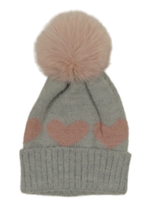 Sivá pletená chlpatá čapica so srdiečkami a brmbolcom