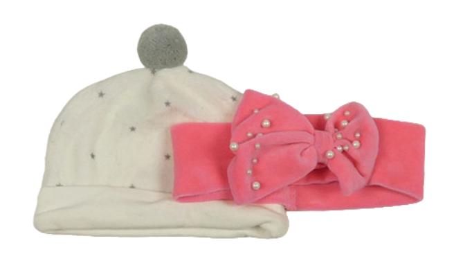 2set - Biela zamatová čapica s hviezdami a bambulí + ružová plyšová čelenka s mašlou s perlami