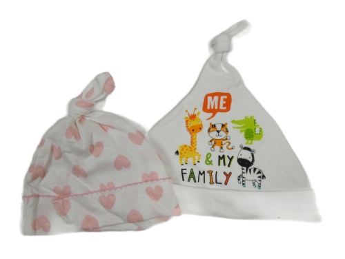 2x bavlněná čepice - biela s růžovými srdíčky + biela so zvieratkami