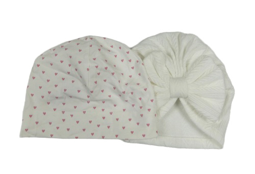 2x bílá čepice - bavlnená so srdíčky + vzorovaná turbanová s mašlou