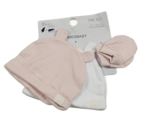 • Nové - 3set - Ružová rebrovaná bavlnená čapica s oušky + bílá puntíkatá + růžové žebrované rukavičky Dunnes