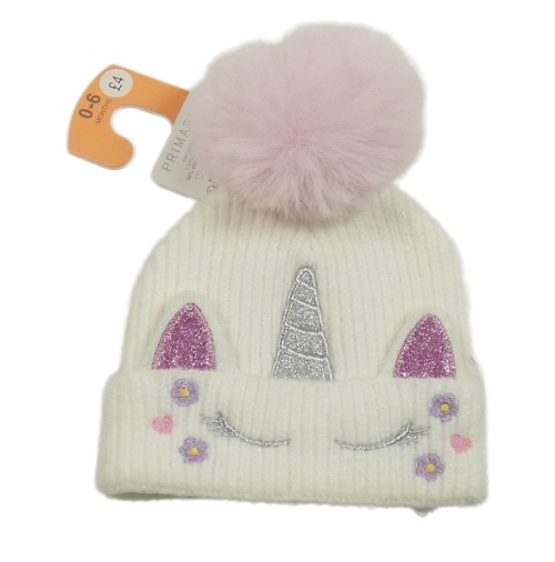 Nové - Biela trblietavá rebrovaná pletená čapica s jednorožcom a brmbolcom Primark