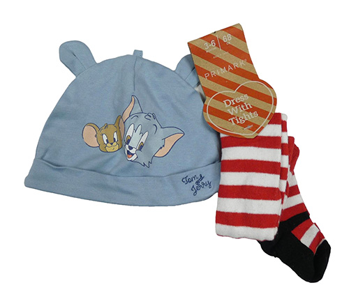 2set - Modrá bavlnená čapica s Tomem a Jerrym + červeno-biele pruhované pančuchy