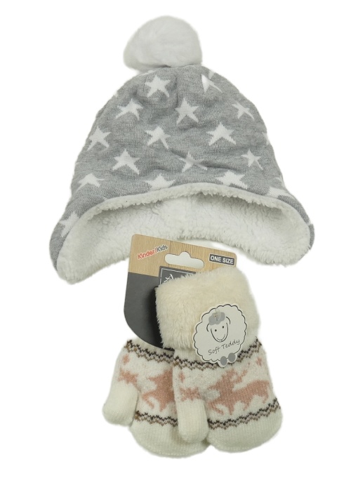 Nové - 2Set - Sivá melírovaná pletená zateplená čapica s bielými hviezdičkami a brmbolcom George + smetanové rukavice s jelenem a kožešinou