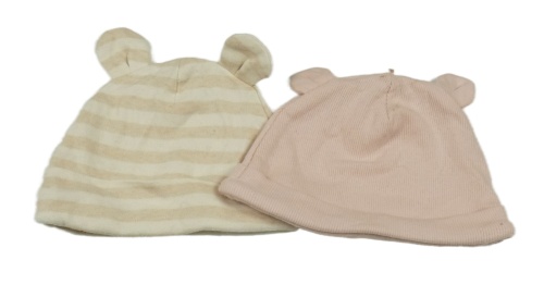 2x bavlnená čapica s oušky - světlerůžová žebrovaná + béžovo-krémová pruhovaná