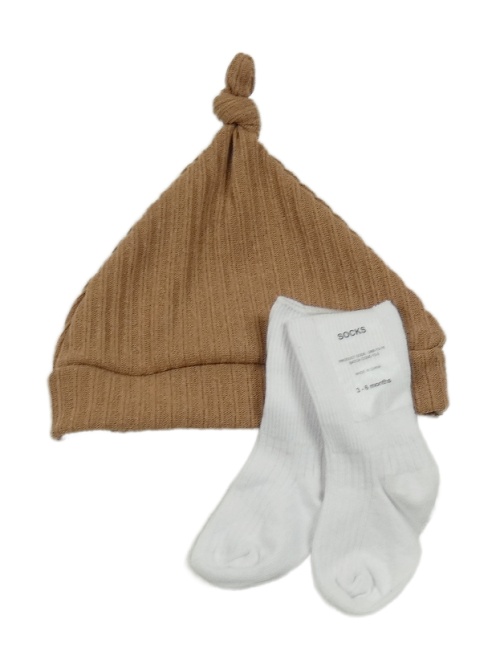 2set - Hnědá žebrovaná čepice + bílé ponožky - nové