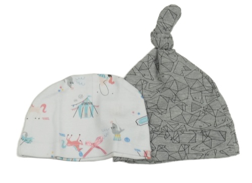 2x - Čepice - Biela s cirkusovými zvířátky, šedá melírovaná s medvedíkmi