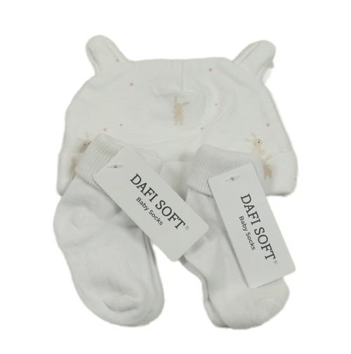 3set - Biela bavlnená čapica s králíky + 2x biele ponožky