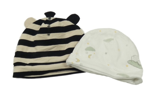 2x - Čierno-béžová pruhovaná + biela bavlnená čapica s obrázkami