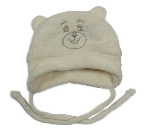 Smotanová plyšová zavazovací čepice - medvedík