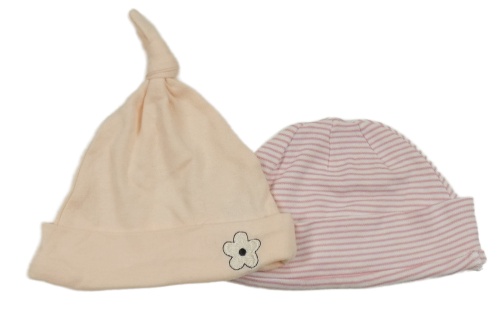 2x bavlněná čepice - marhuľová s květinou + bílo-růžová pruhovaná