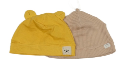 2x čepice - světlerůžová žebrovaná + žltá s uškami