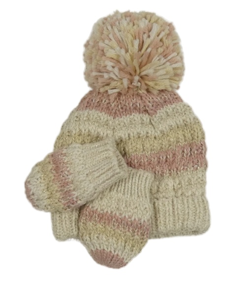 2set - Smetanovo-svetloružová trblietavá čapica s bambulí + rukavice